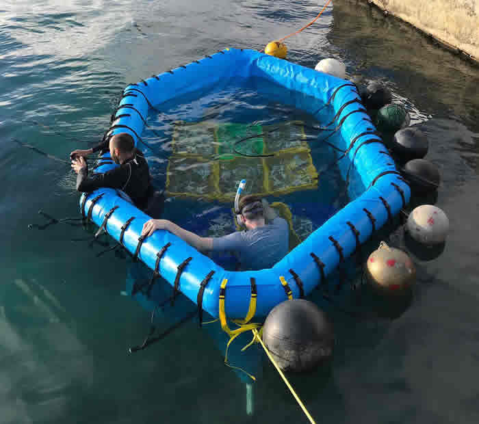 First image- substrates in crates suspended so that coral larvae can find a home on them. Second image is the tank with the canopy on top for shade, and to keep rain out in the first stages where larvae swim freely.