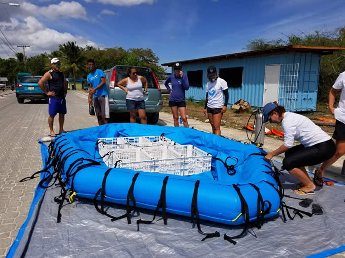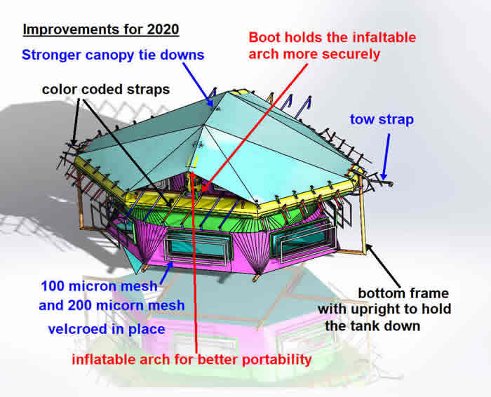 2.0 First immage shows the system with crates loaded with substrates that the larvae settle on. The second immage shows the system with the canopy on top. Most spawning events happen durring the rainy season, so to maintain the proper salinity of the water at the top where the Larvae swim aroud, they need a canopy to keep rain water out. 2.0 New features include: easier to install top frame. and canopy. improved rope attachment system, 12 inch diameter tubes (1.0 had 9 inch dia tubes) Canopy made of pottable water fabric, Double layer windows, and improved bottom zipper system. The Bottom frame has extensions that help hold it down without the need for weights.