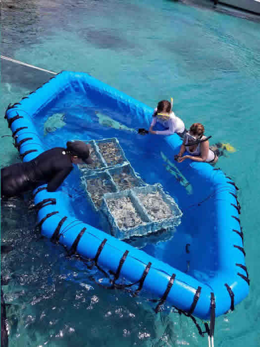 The Coral Kindergarten 2.0 is now in use, and the results are good. Here are a couple of pictures. The design includes improved reingforced stronger rope channels, 12 in diameter tubes, a new canopy design with the water potable fabric. Please have a look at the slide show that shows the evolution of this system. They have proved it works. The corals planted just 18 months ago with the original system (not JPW built) are now getting close to producing their own offspring. Now we need to see how far this Idea goes.