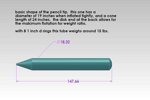 This is the shape of a pencil tip cone with a disk end on the back. The advantage of the disk end is to have even more flotation of the main tube with even less length. Advantage of the pencil tip is slightly more hull speed, and the cone is out of the way