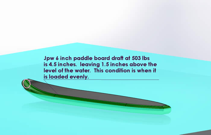 The draft of our ISUP can be computer modeled by making the whole thing solid, then changing the material to Water. Using Archimedes’ Principal, the water displaced by the flotation is equal to the weight on top of the unit. So we use the surface of the water as our point of displacement. If we erase everything above the surface, then we have the weight of the water under the surface that is displaced. Viola! The draft is calculated. Then we give a visual so you can actually see what it means. So at 503 lbs. the board will draft 4.5 inches, leaving 1.5 inches above the surface.