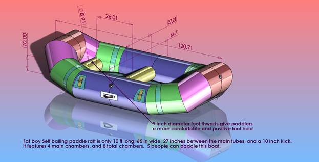 Foot thwarts are a standard feature on the Fat Boy 10 foot self-bailing whitewater paddle raft. This concept allows a paddler to place his foot at multiple angles, and with any comfortable pressure or tension on the foot thwart. Paddlers are much more secure than they would be with foot cups.